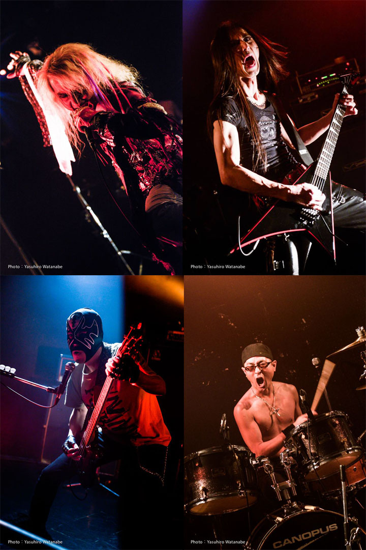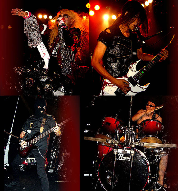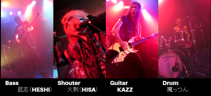 過激なビジュアルのパワー・メタル・バンド。狂気の世界、魂の叫び!猛烈ヘッド・バンキングの”Shouter”火刺、ギターのKAZZ,ドラム魔っつん、サポート・ベース屁志のタイトな高速プレイは必聴。